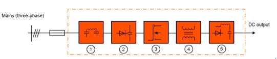 High-frequent disturbances arereduced in the mains filter (1). On the other hand the mains filter is used todampen the interference voltages. The mains rectifier converts the voltage intoDC voltage (2). The power electronics (3) then convert the DC voltage pulsewidth modulated into a staircase-shaped alternating voltage. The internaltransformer (4) stands for a galvanic potential separation and voltageadjustment on the secondary side. On the output side rectification is achievedby fast power diodes (5). On the output side a constantly smoothed and fullycontrollable DC voltage is generated.